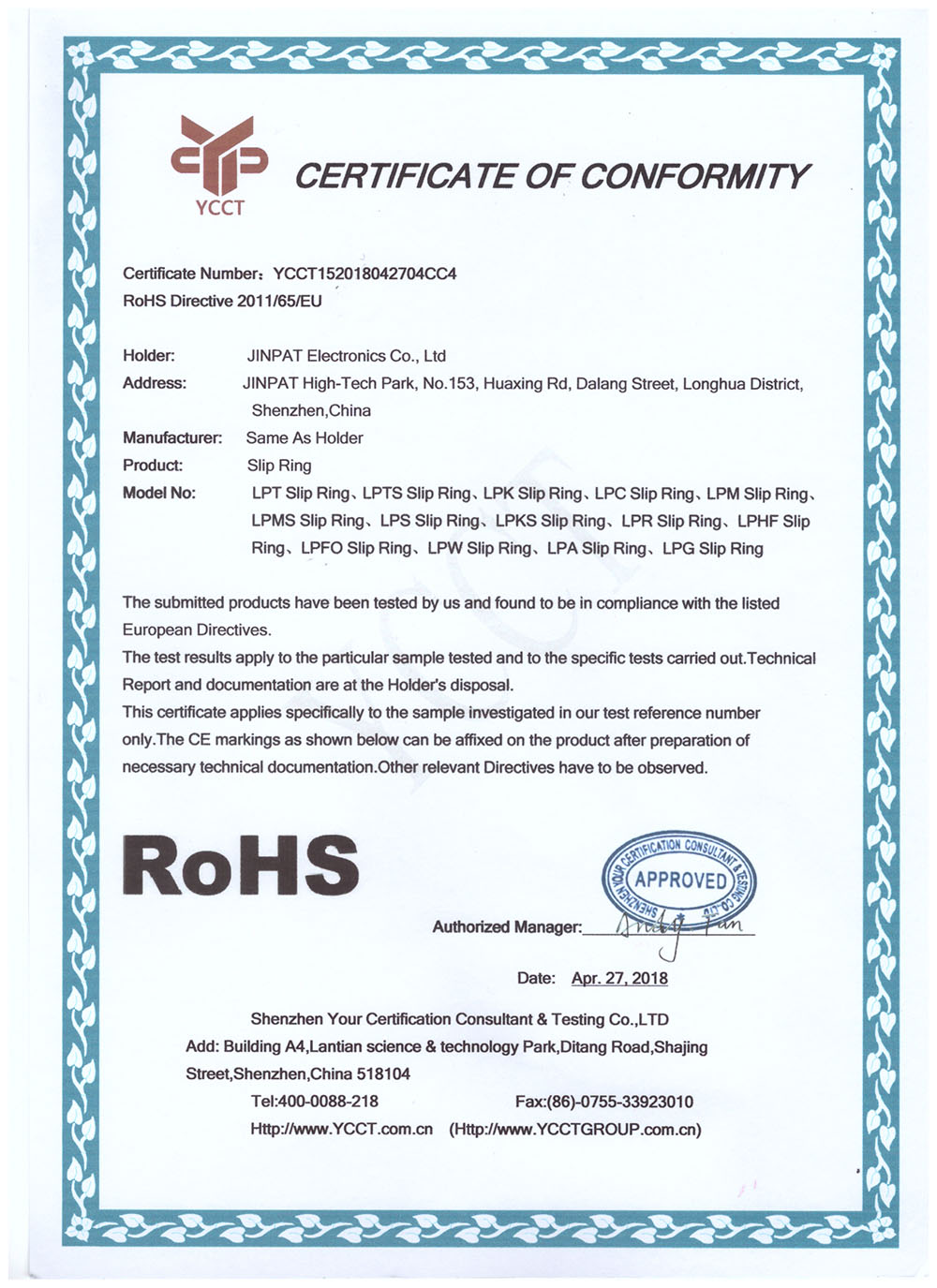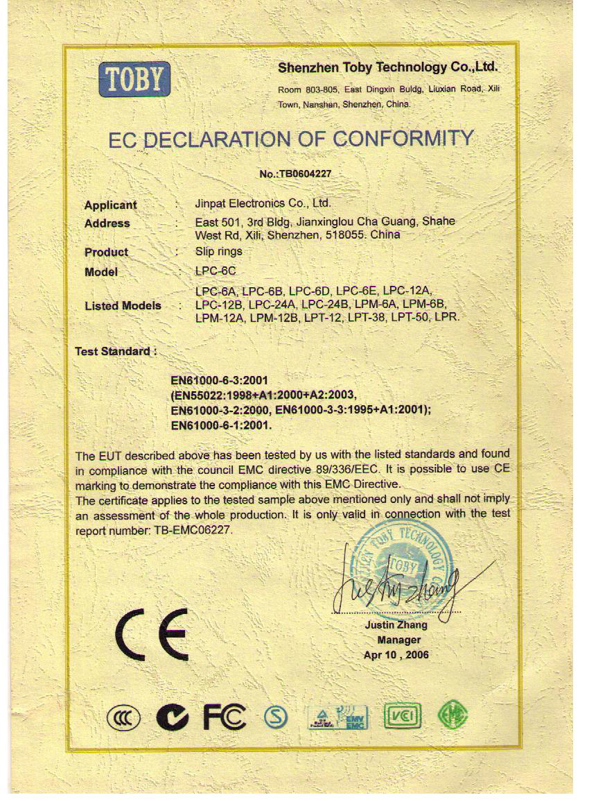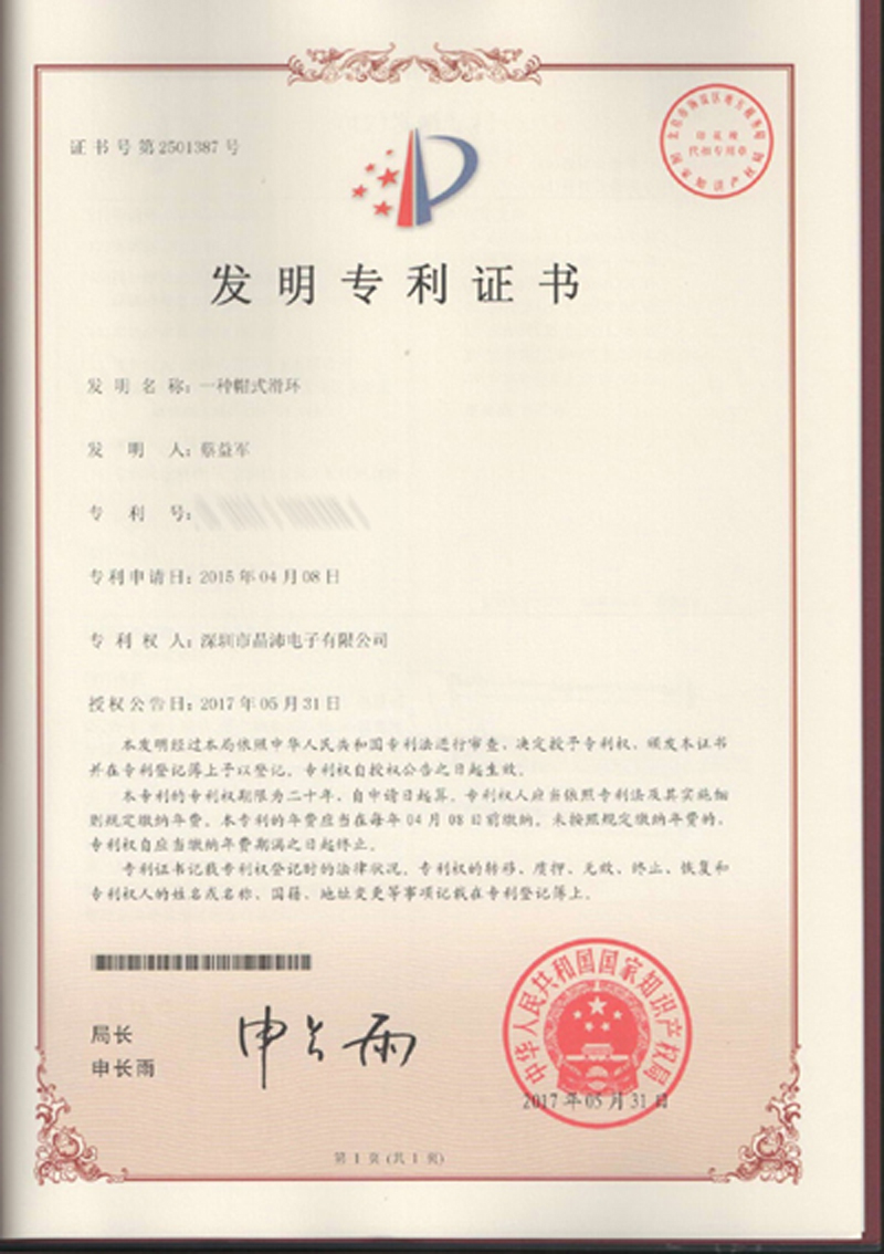 晶沛通過(guò)了歐盟CE認(rèn)證轰动一时、FCC認(rèn)證善有善报、SGS認(rèn)證三顾茅庐、BV“船級(jí)社”認(rèn)證、防爆認(rèn)證等多項(xiàng)認(rèn)證,生產(chǎn)的導(dǎo)電滑環(huán)都符合RoHS環(huán)保要求,先后被授予“國(guó)家高新技術(shù)企業(yè)”稱(chēng)號(hào),目前已獲得45項(xiàng)專(zhuān)利,其中發(fā)明專(zhuān)利6項(xiàng)。